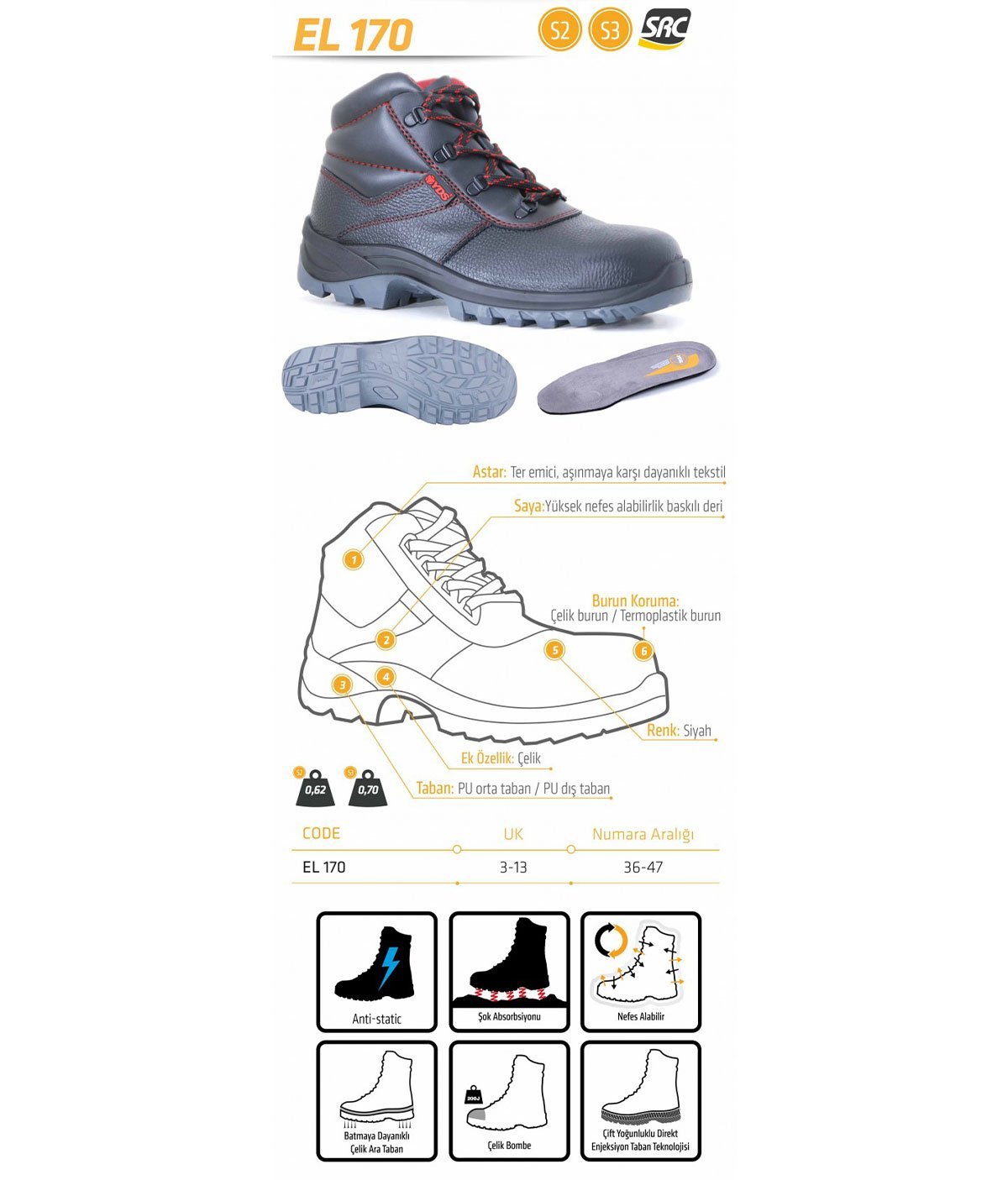 YDS EL 170 S3, ağır sanayi, inşaat ve tehlikeli çalışma ortamları için geliştirilmiş üst düzey bir iş güvenlik botudur. EN ISO 20345 S3 standardına uygun olarak üretilmiş bu model, hem çelik burun hem de çelik ara taban içererek maksimum koruma sağlar.
