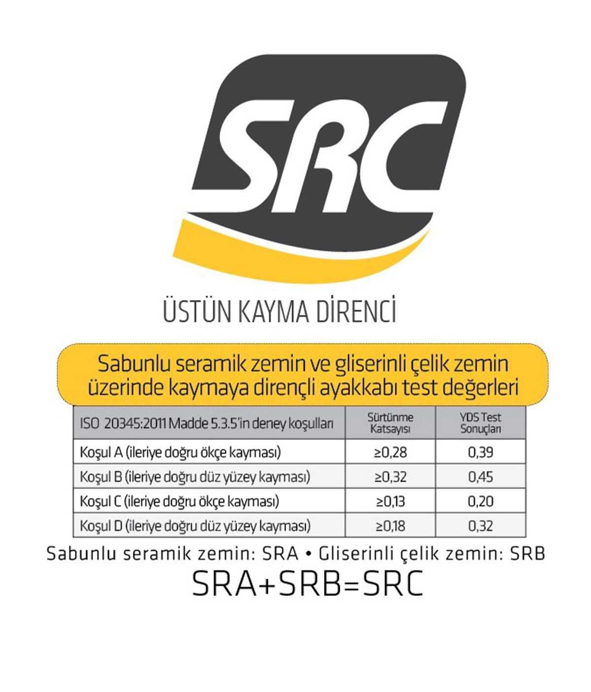 SRC sertifikalı kaymaz taban, ıslak ve kaygan zeminlerde mükemmel tutuş sağlar. Antistatik özellik, elektriksel riskleri azaltırken, çift yoğunluklu enjeksiyon taban teknolojisi darbe emilimi ile ayakta geçen uzun saatlerde konforu artırır.
