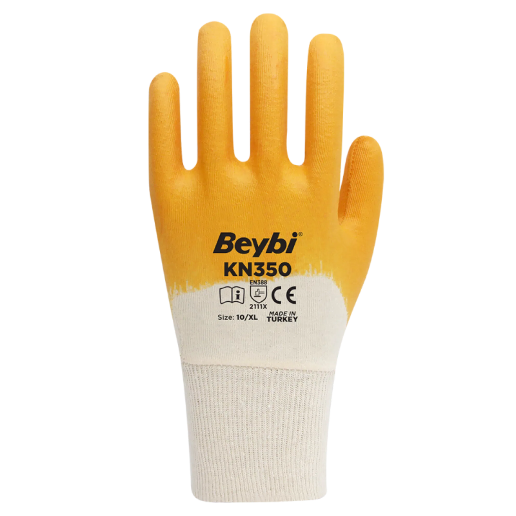 BEYBİ KN350 Sarı Nitril Eldiven, pamuk astar üzerine nitril kaplama yapısı ile konfor ve korumayı bir arada sunan bir iş eldivenidir. Özel kalıbı ve örgü bilekliği sayesinde eli kavrar, kullanım sırasında kayma yapmaz ve rahat bir kullanım sağlar.