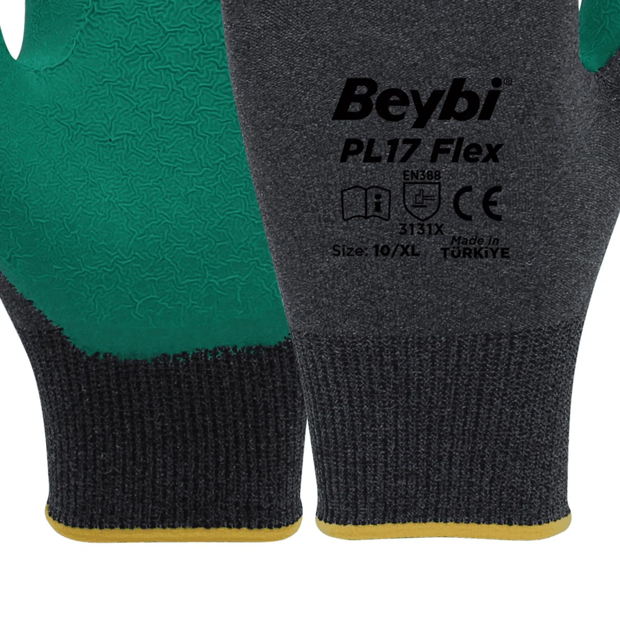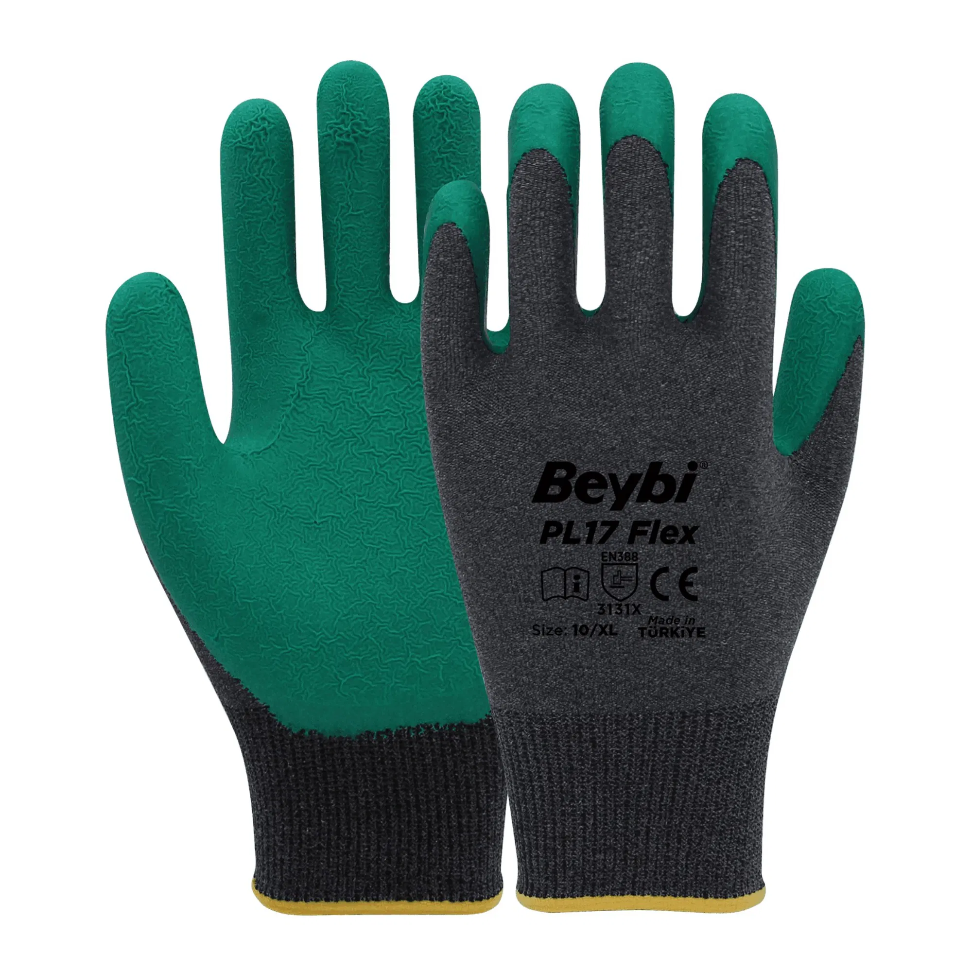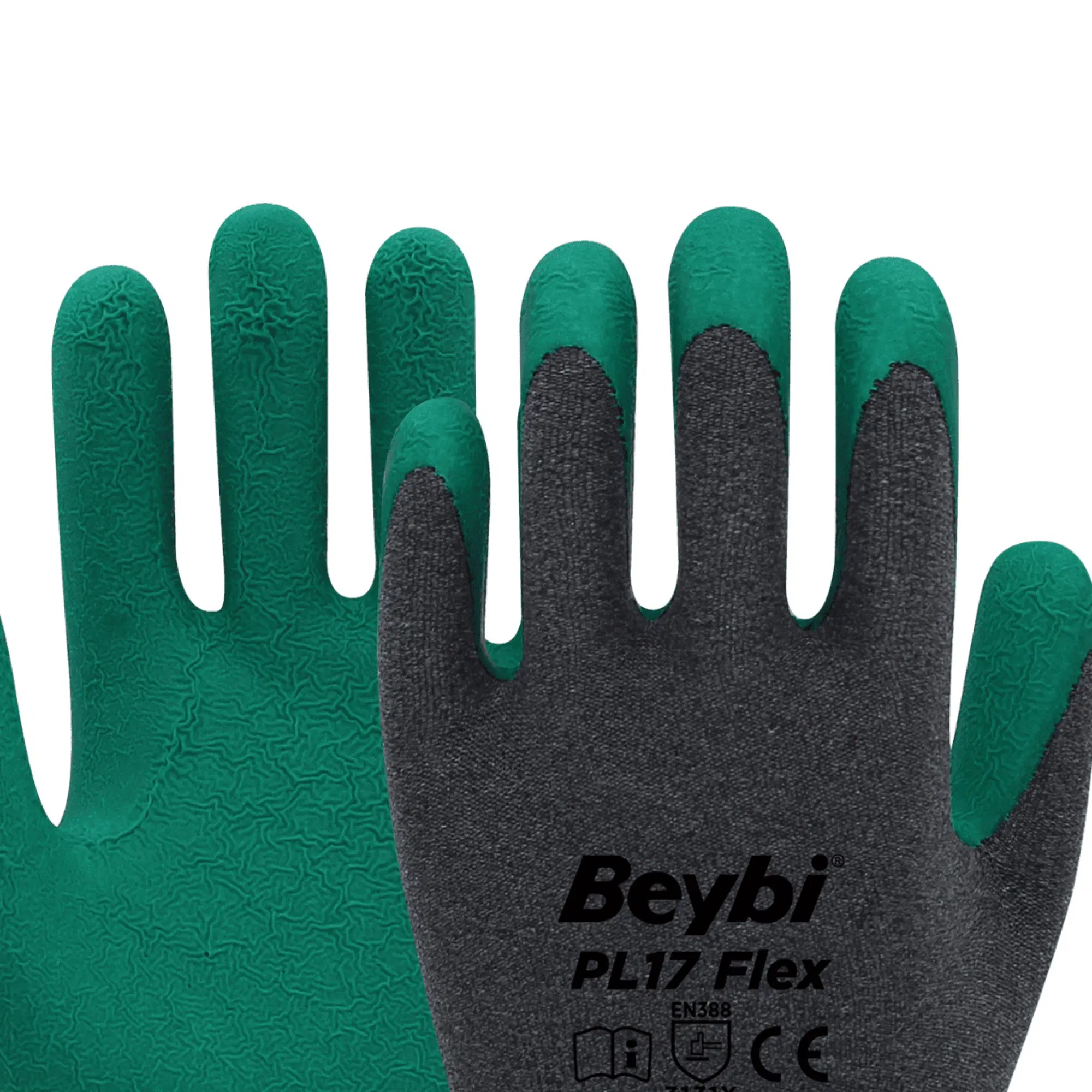 Beybi PL-17 Flex Lateks Eldiven Yeşil-Gri No:10 | Crinkle Lateks Kaplı, Kaydırmaz, Dayanıklı İş Eldiveni
